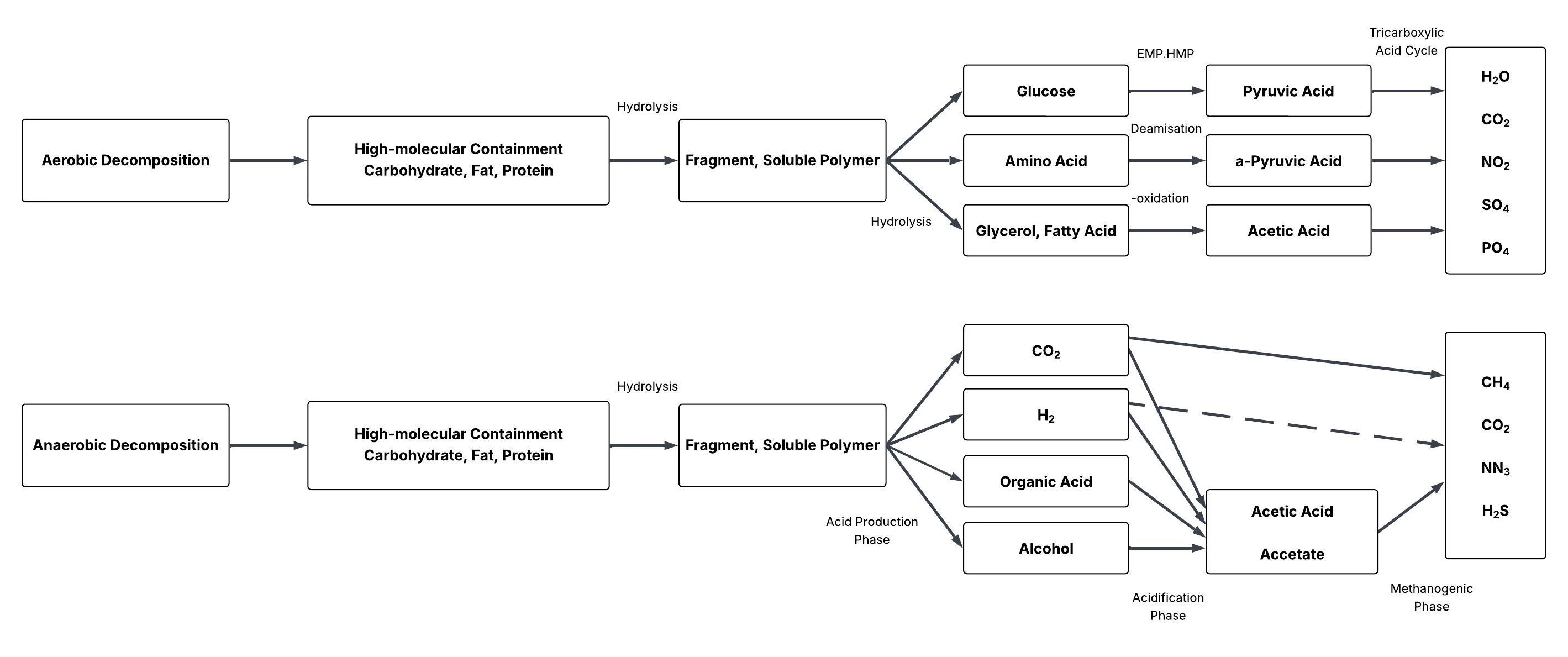 The breakdown of high-molecular contaminants like carbohydrates, fats, and proteins occurs through two main routes depending on the availability of oxygen.